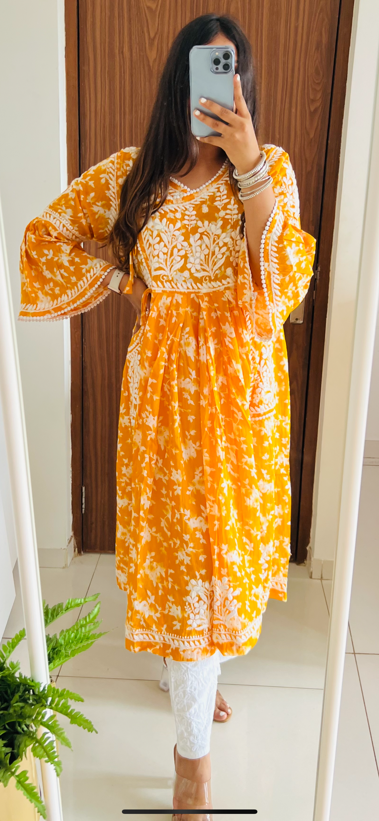 - Design - Angarkha kurta with detailed hand embroidered Chikankari work, with side pockets on premium mulmul fabric, enhanced with bell sleeves( Flowy sleeves)